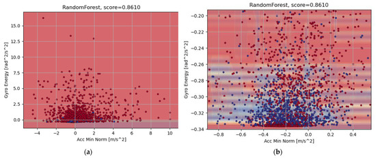 The first step was to determine the hyperparameters with the training set. We found the best hyperparameters by Grid Search [22]. By choosing the k = 3 for the k-fold cross validation, we increase the amount of test data. Although the dataset comprises more than 6000 frames, the dataset is separated in three sections, as one can see in Figure 6 and Figure 7. Each section contains about 2000 frames, and thus it is important to increase the test set to avoid a marginal amount of data with respect to a section. The three-fold cross-validation achieved a score of 87.51%. Furthermore, we trained the Random Forest with the training set and tested the predictions with the same data. The test resulted in a correct prediction rate of 94.52%. Finally, to evaluate the algorithm and to see if the classifier generalizes well, we tested the trained classifier with the test set, which was never seen during training. The Random Forest contains 20 decision trees with a maximum depth of 20, respectively. The test resulted in a correct prediction rate of 86.09%. Consequently, it seemed that the classifier does neither overfit nor underfit and is generalized with more than 85% of the correct prediction rate. In Figure 8, we can see that 92% of the class bad was positively predicted as bad, and therefore about 8% was negatively predicted as good. On the other hand, the performance of the class good was worse. Only 66% of the class good was positively labeled as good, which is slightly better than a random guess. Thus, 34% of the class good was negatively labeled as bad. Therefore, we took a closer look at the ratios of those predictions. In total, the number of frames in the test set was 1964. On the other hand, the precision of the class bad was nearly 91% with a recall of nearly 92%. The precision with respect to the class good on the test set was about 70%, providing a recall of 66%. Figure 9 represents a RF based on the training of (a), and obtained a test score of 86.1%. The red area denotes the class bad, and the blue area denotes the class good. The strong overlap was responsible for the relatively low precision of class good. Investigating more detailed representations of both classes, we saw that class bad generalized well on unseen data, but class good tended to overfit; neither revealed a good performance on training data or on test data. Table 1 represents the feature importance during training. The features regarding the angular velocity seem much more important, by factor ten, and had greater impact on the splitting of the leaves during training. However, the combination of acceleration and angular velocity was mandatory and achieved the highest performance.