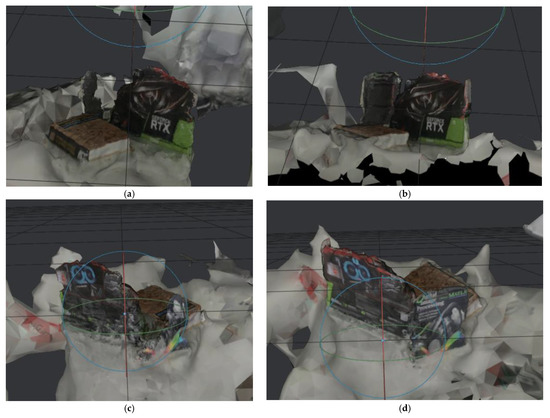 Resulting mesh of a 3D reconstruction of images by the open-source software Meshroom. (a,c) represent the result of the reconstruction due to the whole set of captured frames. On the other side, (b,c) represent the result of the reconstruction based on selected key frames by the proposed method. (a) The front side of the resulting mesh due to non-filtered frames, (b) the front side of the resulting mesh due to selected key frames that were determined by the proposed method, (c) the back side of the resulting mesh due to non-filtered frames, and (d) the back side of the resulting mesh due to filtered frames that were determined by the proposed method.