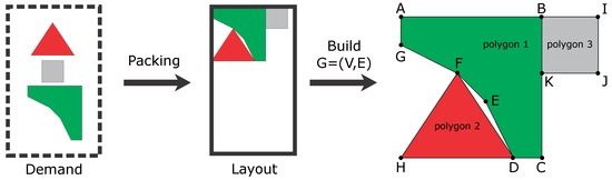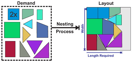 Prior to the solution of MTCP, a packing procedure is executed to achieve maximal surface area utilization [5,6]. In other words, all the items must be arranged within a surface of fixed width and minimal length, as illustrated in Figure 1. According to Araújo et al.’s taxonomy [4], this is a problem, that is, two-dimensional, with a single input minimization and an open-dimensional volume. Wäscher et al. used the term strip packing problem to refer to such [7]. In addition, the literature contains several constraints that resemble more realistic settings, including the requirement for guillotined cuts [8] or irregular objects [9].