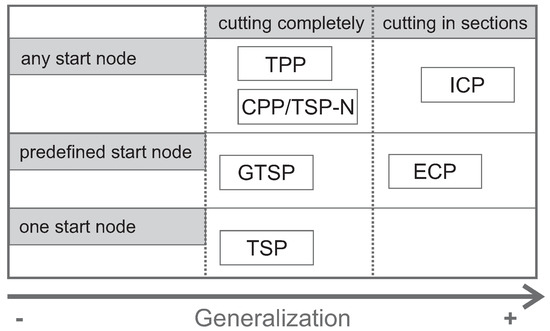 The literature contains several examples of algorithmic approaches for CPD. Dewil et al. [25] proposed grouping these methods according to the technique for traversing the vertices of the polygons. Three categories (here presented with examples of studies that employ such an approach) were identified by the authors: the touring polygons problem [26,27]), the traveling salesman problem (TSP) [28,29], the generalized TSP [30,31], and the TSP with neighborhoods [21]. Figure 2 presents a classification for CPD and the degree of generalization for this problem. The generalization level grows considering the flexibility of starting a path at any point of an item’s layout. Besides, it is possible to cut only segments of a part, not necessarily starting and ending the cutting contour in the same item.