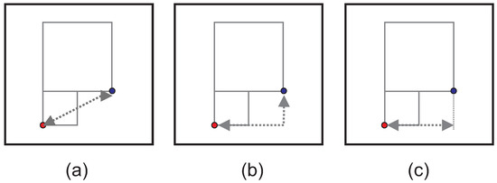 Distance metrics: Euclidean (a), Manhattan (b), and Chebyshev (c). The continuous lines represents the layout, and the points in red and blue represent the two points considered in our example of the three distances used. The dashed lines represent the value of the distance between these two points. The Euclidean distance is the usual shortest line that connect both points; the Manhattan distance is the horizontal euclidean distance plus the vertical Euclidean distance between them; and, finally, the Chebyshev distance is the maximum value between horizontal and vertical Euclidean distances.