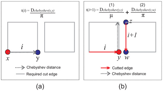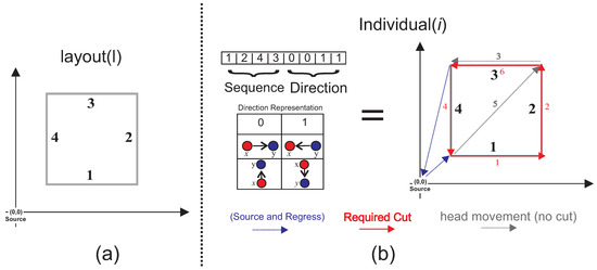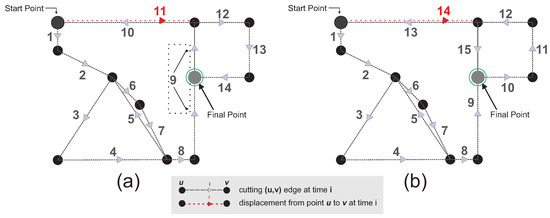 Moreover, the order () and direction () determine the plan of the complete cut. Therefore, when treating each element of the representation vector, we applied an offset assuming the shortest distance (Chebyshev) possible for cases in which the target node of one edge i does not match the origin node of the next . We assumed that 0 represents “left-to-right” or “bottom-to-up,” in other words, for edge (), we considered the initial point to visit u and the final point v, and 1 depicts the directions back.