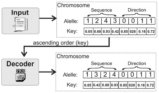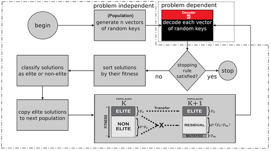 Genetic algorithms with random keys (RKGA) were introduced by [44] to deal with combinatorial optimization problems involving representation adapted to sequencing. In an RKGA, each chromosome is represented as a vector of real numbers in the range , where n is the problem’s dimension. A decoder receives a chromosome and maps it into a feasible problem solution. Resende [45] proposed the Biased Random-Key Genetic Algorithm (BRKGA), in which the individuals are selected in the recombination process, and it also contains the highlighted function of the probability of inheriting information from the parents ().