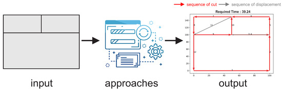 MTCP problems have a primary objective: the minimal time required for cutting the pieces represented by an input layout [5,6]. This data concerns the packing of all the items within a surface that represent the raw material, as illustrated in Figure 1. The position of pieces in the layout stage can be performed by computer-aided design (CAD) systems [10,11] or generated by algorithmic methods [8,12,13,14]. Wäscher et al. used the term strip packing problem to refer to them [7]. In addition, the literature contains several constraints that resemble more realistic settings, including the requirement for guillotined cuts [8] or irregular objects [9].