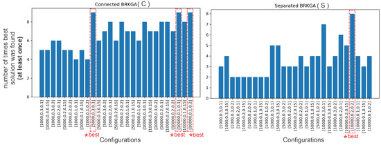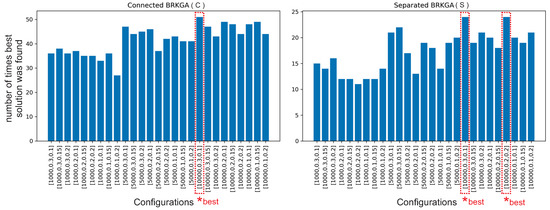 Figure 11 presents the number of times that a BRKGA hyper-parameter setting achieved the best solution found. For connected layouts (C), the best GA configuration addressing relation-1 (instances/executions) was obtained using the following hyper-parameters after 49 times: P = 10,000, , and . In the separated instances group (S), the best solution was obtained after 20 executions, and the configuration was the following: P = 5000, , and .