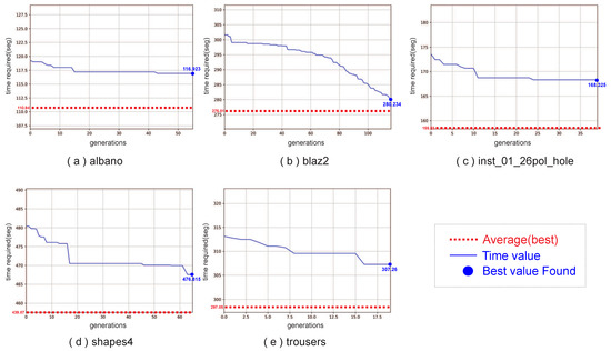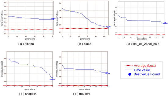 Lastly, we defined relation-3 setting the configuration using each parameter option that occurred more frequently in the best solutions (modal value): P = 10,000, Pe = 0.3, and Pm = 0.10. A comparison between vertex numbers (V) and population size (P) exposed that the configuration that hyper-parameter settings with population equal to 10,000 failed to achieve the best results for instances with . For example, for the instances inst_01_26pol (V = 210) and trousers (V = 350), the value of P in the configuration that presented the best solution was 1000 for both cases. Therefore, the following hyper-parameter was selected for further experiments: P = 5000, Pe = 0.30, and Pm = 0.1. The progression of the BRKGA is shown in Figure 15 and Table A3 (see Appendix C.1) and Table A4 (see Appendix C.2). Since the configuration failed to reach the average result for both connected and separate instances, it is possible to affirm that increasing the timeout would enable better solutions.