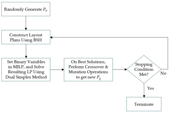 A GA is developed for the UA-FLP presented in previous sections. The proposed GA consists of a BSH, LP model, and a dual simplex method. The GA consists of the following five stages. See Figure 2 for a flow diagram of the stages of the proposed GA: