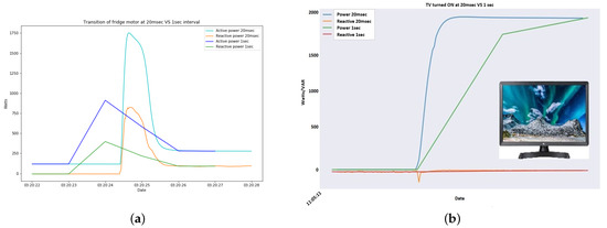 Figure 1, two different devices are measured with 1 s interval, which is usually the smallest in the literature for low-cost smart meters, and 20 ms interval. It is clear that with 1 Hz sampling rate important information related to the transients is lost.