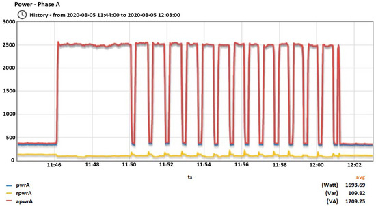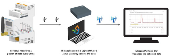 34]. Apart from these variables, it also computes energy-related quantities as well as the RMS of harmonics on the phase and the neutral currents and on the phase voltages, together with active, reactive and apparent powers, and the power factor and harmonic distortion on each harmonic for all phases. Total harmonic distortion (THD) is computed for all phases for current and voltage. Another distinctive characteristic of the particular low-cost smart meter when compared to others is that the interval between successive measurements (the sampling rate) is at 20 ms (50 Hz). In