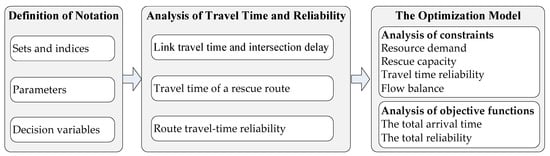 In this section, a multi-objective optimization model of rescue resources is developed by considering the travel time and reliability of the rescue route. The travel time of links and intersection delay, the travel time and reliability of the rescue route are analyzed based on the mathematical notations defined in Section 2.1. Moreover, the constraints of resource demand, rescue capacity and flow balance, etc., are analyzed, and two objective functions are formulated in Section 2.3. The flow chart of this section is presented in Figure 1.