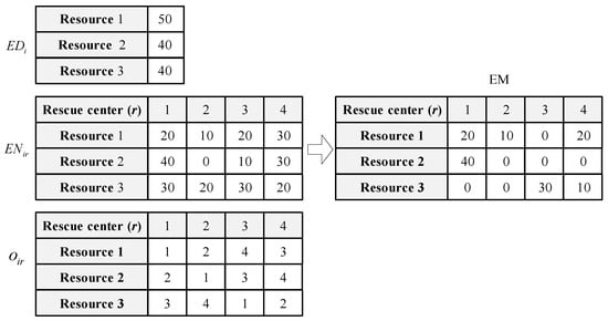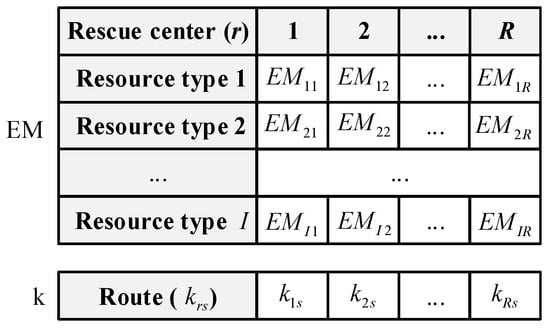 Accordingly, the index of rescue routes and supply quantity of rescue centers , which are the decision variables, are both positive integers. Therefore, integer encoding is adopted, and is designed as a chromosome. For sub-chromosome EM, a positive integer I×R matrix is used to represent the supply quantity of rescue centers. A gene in this sub-chromosome represents the supply quantity () of the rescue center r for rescue resource i. For sub-chromosome k, a vector with r elements is adopted to represent the index of rescue routes for each rescue center. Figure 2 shows a chromosome with I rescue resource types and R rescue center.