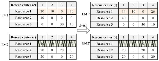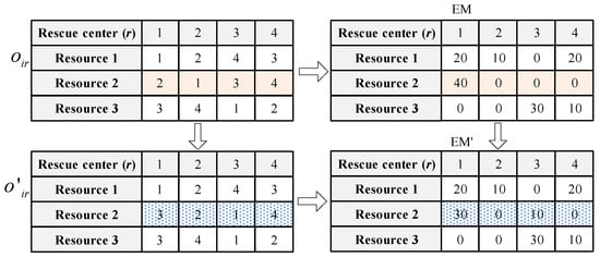 For sub-chromosome EM, the mutation operation is carried out by regenerating the random sorting weight. Let us randomly select a rescue resource type i, generate a random sorting weight , calculate the comprehensive ranking value and regenerate the sub-chromosome EM of i according to the generation method based on random sorting. Assume that the resource 2 is selected for mutation. Figure 6 shows the mutation process for sub-chromosome EM.