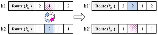 Let denote the sequence number of the rescue center r sorted in descending order according to the minimum expected travel time of the rescue route for rescue resource i. Correspondingly, let represent the sequence number of the rescue center r sorted in ascending order according to the reliability of the rescue route for rescue resource i. Generally, the higher the amount of resources provided by the top rescue centers, the better the quality of chromosomes for this object. Let us set the comprehensive ranking value of rescue centers for rescue resource i as and the weight of random sorting as , respectively. Then, comprehensive ranking can be defined as follows.