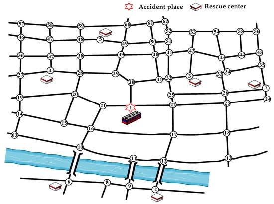 Therefore, in the case of a railway dangerous goods accident, transportation of rescue equipment (such as fire truck, fire sprinkler, fire water monitor, emergency lighting equipment, chemical rescue vehicle, special rescue vehicle, medical rescue vehicle, etc.) and resources (such as rescue medicine, air respirator, etc.) to the accident location is urgently required. At the same time, due to the influence of rescue capacity, location, road network, traffic environment and traffic flow of each rescue center, the appropriate rescue resource scheduling and routing plans need to be integrated and reasonably arranged.