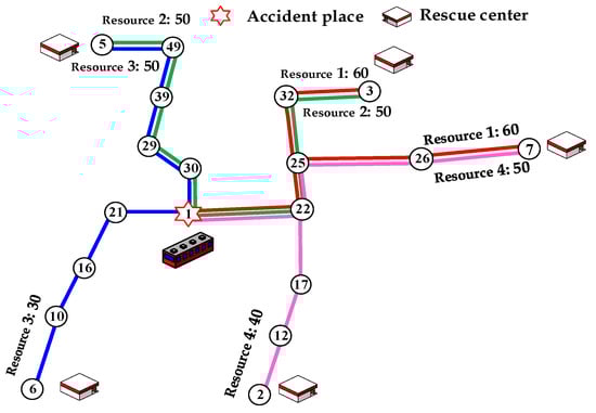 By using the method of information entropy, synthesized objective values can be obtained, and the synthesized objective values of Scheme 2 and Scheme 3 exceed 0.9. It can be observed that Scheme 2 is relatively better in two objectives (2945, 387.92), and the rescue resource scheduling of Scheme 2 is shown in Figure 9.