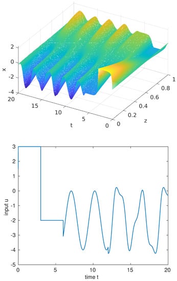 Solution of the pde model (1) using finite-difference approximation with collocation points (top) and corresponding input (bottom).