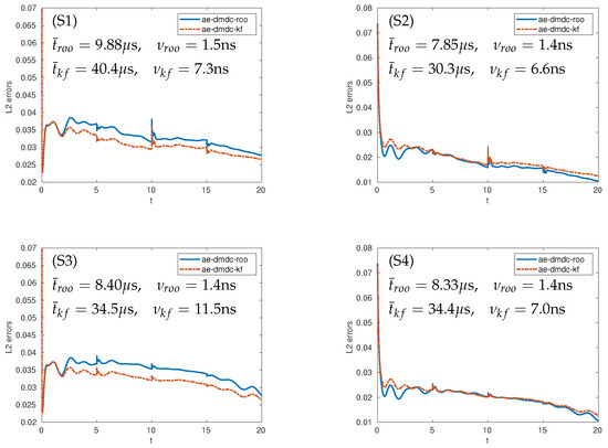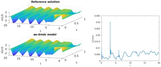 The obtained results with , are shown in Figure 5. On the left of the figure, the comparison of the reference solution and the autoencoder-DMDc (ae-dmdc) based approximation can be seen. On the right part of the figure, the associated approximation error norm is shown.