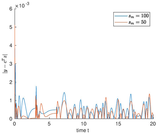 The resulting absolute error of the output approximation is shown in Figure 6 for the two different sensor locations and .