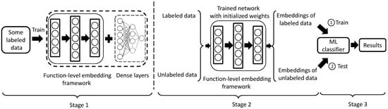 The proposed framework is designed for the scenario where there are some labeled data for a software project. This scenario consists of three stages: the first stage is to train the neural network with the labeled data; the second stage is to feed both the labeled and the unlabeled data to the trained network to obtain one of the hidden layers’ output as the learned function-level embeddings; and in stage three, the resulting embeddings can be used as feature sets for subsequent process, e.g., to train a conventional ML classifier for further classification.