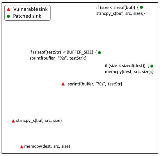 To evaluate whether the ELMo can generate different embeddings for a target sink function based on the difference contexts, we constructed three potentially vulnerable functions which do not have any validation for the parameters and three patched versions with if statements for validation of the parameters prior to the functions being called. Figure 3 shows the 2D plot of these function embeddings learned by the ELMo. The t-SNE algorithm was used to map the 1024-dimensional vector representations to a 2D plane. It can be seen that the learned representations of the vulnerable functions represented by the red rectangles are separated with that of the corresponding patched versions, which have if statements for validation. It proves that the contextual information (i.e., with or without validation) of the code can be learned by the ELMo. This will facilitate the analysis for vulnerability detection.