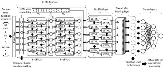 After the sequences are truncated to the unified length, they are ready to be fed to the network. As Figure 4 shows, the ELMo module followed by the input layer treats each source code function (untokenized) as a sentence. The ELMo module integrated in our network is provided by Tensorflow Hub (https://tfhub.dev/google/elmo/2, accessed on 10 November 2021). It is a 5-layer neural network, which exposes three trainable parameters for the aggregation of the first three layers. We remove the mean-pooling layer so that the fourth layer, which is the ELMo word embedding layer, outputs the word embeddings acceptable by the subsequent Bi-LSTM layer. The Bi-LSTM layer contains the 64 forward and 64 backward LSTM units, respectively, forming a bi-directional structure. Then, outputs of the forward and backward LSTM units are concatenated and passed to a pooling layer. To speed up the Bi-LSTM training process, we use the CudnnLSTM implementation, which is the LSTM based on the NVIDIA CUDA deep neural network library (https://developer.nvidia.com/cudnn, accessed on 10 November 2021).