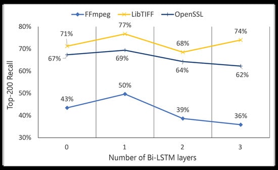 The top-200 recall of our framework with different number of Bi-LSTM layers on projects: FFmpeg, LibTIFF and OpenSSL.
