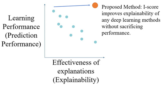 DARPA document (DARPA-BAA-16-53) proposed this figure to illustrate a basic Explainable AI problem [19,20]. It presents the relationship between learning performance (usually measured by prediction performance) and effectiveness of explanations (also known as explainability). The proposed method in our work aims to take any deep learning method and provide explainability without sacrificing prediction performance. In the diagram, the proposed method is the orange dot on the upper right corner of the relationship plot.