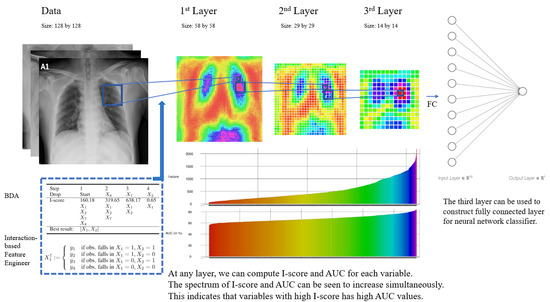 Proposed Architecture. The executive diagram of the proposed architecture is presented in Figure 2. First, the architecture starts with image data that consists of X-ray pictures sized 128 × 128 (see detailed discussion of COVID-19 data set in Section 4). The architecture proposes using a 2 ×2 rolling window (we use a 2 × 2 window for simplicity; larger sizes can be applicable as well in practice depending on the data). Since the window size is 2 × 2, this means there are four variables every time the window rests on a certain location of the image. Within this subset of variables, we execute the proposed backward dropping algorithm (BDA). This procedure finely selects a subset of variables that is highly predictive by omitting the noisy variables in this small neighborhood on the image. Next, the selected variables (which can be any subset of the original four) undergo a proposed procedure called interaction-based feature engineer (see (6) for a definition). The BDA procedure is illustrated in the bottom left corner of Figure 2 (we use a 2 × 2 window for demonstration purpose). In addition, we set the starting point to be 12 which means we start from the pixel in the 12th row and the 12th column. From data (size of 128 × 128) to the 1st layer (58 × 58), this procedure produces a new feature matrix with size on both edges, which means the new feature matrix has 58 × 58 variables (the formula is presented in Equation (18)). This feature matrix constitutes the first interaction-based convolutional layer. We can then use the same methodology to construct the second and third interaction-based convolutional layers. The third interaction-based convolutional layer can be used as the input layer for a neural network classifier. For each layer, we can compute the proposed I-score and the AUC value (see Section 4.4 for a detailed discussion of AUC values) for each variable (assuming using this variable as a predictor when computing the AUC value). The paths of the I-score and AUC values have parallel behavior, which is shown in the color palette of the spectrum in Figure 2.