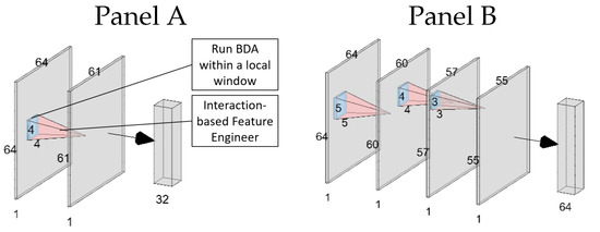 This section proposes an interaction-based convolutional neural network. This action is presented in Figure 3. In this diagram, we start with an image that is sized 64 × 64 and suppose we use a window that has a size of 4 × 4. Thus, this small window has 16 pixels locally. This set of 16 pixels can be converted into binary variables, which hence provides a well-defined partition. For example, we can discretize these pixels into black and white. In other words, each pixel takes value 1 or 0 (two levels) and the set of 16 pixels would create a partition that is sized . This is the set up for us to run the BDA. Based on the definition of the BDA, in each round, we take turns dropping one variable iteratively. Every time we drop a variable, we compute the I-score. We drop the variable at each step such that the I-score is the highest if that variable is dropped. Using this procedure, we are able to select a subset of variables out of the original 16 pixels.