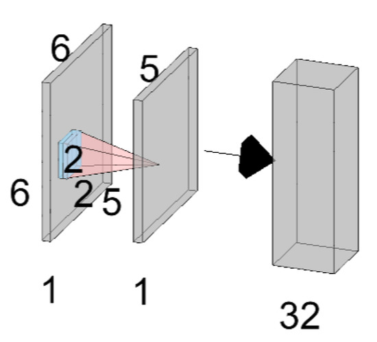 The network architecture with simulated data. The artificial data has variables, which can be arranged in a grid structure with shape of 6 × 6. We use a window size that is 2 × 2. By passing this window from the top left corner of the original 6 × 6 matrix, we create a new 5 × 5 matrix. The number 32 is the number of units in the hidden layer. In this example, there is one hidden layer, which is sufficient for the dimension of the data in the example.