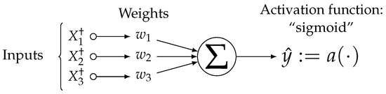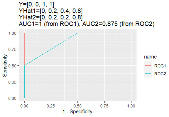 Area under the curve (AUC). The AUC value is a single number derived from a predicted probability by a classification rule and the true label [32]. Given a vector of the true label Y and a vector of the predicted probability , we can use statistical package pROC (The package is called Display and Analyze ROC Curves. Source: https://github.com/xrobin/pROC (2 November 2021)) to assist this computation. The package uses automatically generated thresholds to convert into binary format. For example, we can use a threshold of to convert a vector of the predicted probabilities into binary form by writing . Let us assume the true label to be . Thus, we can compute specificity as one and sensitivity as one1. We can then change threshold to a different value to compute another pair of specificity and sensitivity. By tracking all pairs of specificity and sensitivity, we can generate a curve called the ROC curve [32]. The value of the AUC is exactly the area under the ROC. Assume the predicted probability contains some mistakes. In other words, let us assume the predicted probability vector is . It is not possible for two observations to have the same prediction probability when they come from different classes. Therefore, there must be a mistake in one of them. This information is reflected using the same procedure (Table Figure 7).