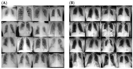 Visualization Interpretation. The plot in Figure 9 of the original images for patients infected by COVID-19 has grey and cloudy textures in the chest area. Because an X-ray is at its brightest when most of the light beams emitted bounce back from the object, bones show as white and the margin is completely black. For muscle and organs inside the human body, X-rays that are emitted can only be partially collected; this causes the greyscale on the X-ray images in the chest area. For COVID-19 patients, there are grey and shaded areas in the chest X-rays. This is due to the inflammatory fluid produced when patients exhibit pneumonia-like symptoms. The fluid inside the chest area is a consequence of the human immune system fighting outside diseases. This shaded area (as seen in panel A in Figure 9) prevents us from observing clear areas in lungs. This is different in panel B, where the lung areas are dark and almost black, because a healthy lung is filled with air (i.e., the black present in normal cases’ X-ray images). The black and white contrast in the two panels is directly related to how much inflammatory fluid is present in human lungs. This contrast translates to greyscale on pictures and is directly related to COVID and non-COVID cases (i.e., response variable Y). The same contrast can be seen using the new variables (these are based on Equation (6)) in the 1st Conv. Layer (sized 61 by 61). For COVID-19 patients, the lung area is cloudy and unclear, whereas for the healthy cases, it is clearly visible. This is not a surprising coincidence because the proposed new variable modules, , are engineered using Equation (6), which relies on the response variable in the training set. The 61 by 61 images from the proposed algorithm are a direct translation of not only the original pixels but also the response variable. In other words, this visualization presents how the I-score considers image data.