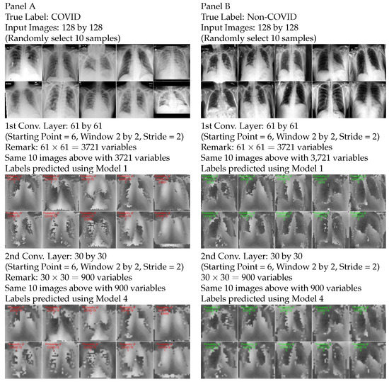 Original Images in the 1st Conv. Layer. The input images are sized 128 by 128. With the 1st Conv. Layer constructed, we have new variables. We return to the same samples as shown in the first row in Figure 9 and use these 3721 variables only. When we plot these samples with these new variables, we resize them back in a 61 by 61 matrix form. Panel A represents the COVID class and panel B represents the non-COVID class. In addition, we use Model 1 in Table 10 to produce the texts that state the predicted probability of the COVID class. The red indicates the ground truth as COVID class (panel A) and the green indicates ground truth as non-COVID class (panel B).