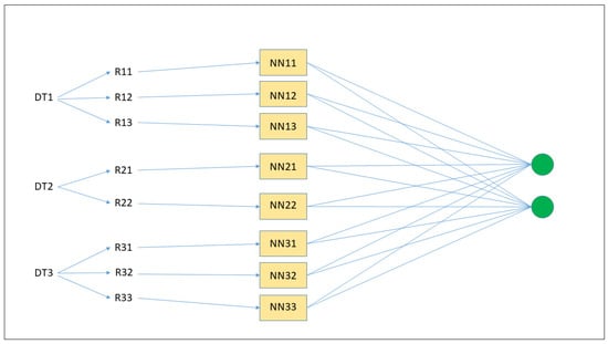 Transformation of an ensemble of three DTs into an ensemble of neural networks. First, from each DT, a number of rules are generated (R11, R12, etc.); second, each rule is inserted into a single neural network (NN11, NN12, etc.); third, the final classification is the result of all of the neural networks’ classifications.