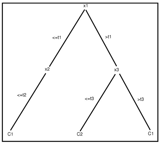with as the input variable (or attribute) and as a real number. Class C designates a class among several possible classes. Figure 2 illustrates an example of a decision tree. The learning phase of such a model consists in determining at each node of the tree the best attribute for accurately dividing the learning samples. Many possible criteria can be used to determine the best splitting attribute; for more details, see [26,27].
