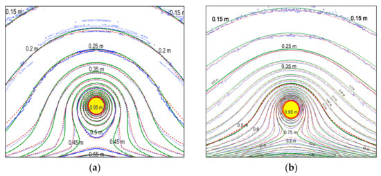 where r represents the distance from the center of the initial water surface elevation (r ≤ r0). In Figure 2a,b, showing the results of testing on model bottom reliefs, the upward direction coincides with the offshore direction. The propagation of the wave generated by the described round-shaped source was simulated using MOST software, and by the MacCormack difference scheme implemented on an FPGA. According to the results of calculations for each of the schemes, isolines of distributions of wave height’s maxima over the sloping bottom (Figure 2a) and at the parabolic bottom topography (Figure 2b) were visualized.