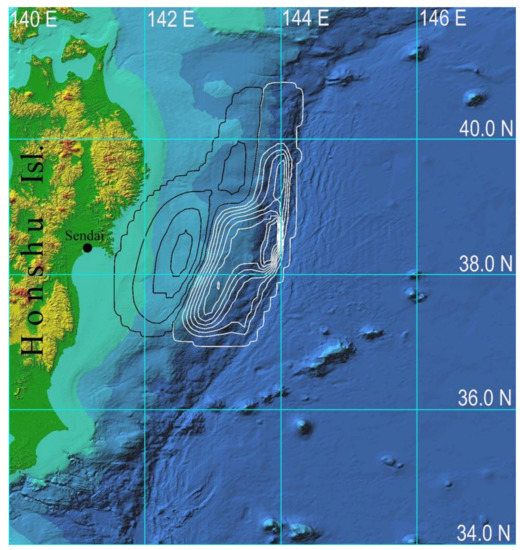 Digital bathymetry and tsunami source of the 11 March 2011 event. The isolines of the field of vertical elevation of the water surface at an interval of 1 m are drawn in white, and the isolines of the initial abatement of water level are drawn in black. The source is outlined by ±0.05 m level lines. The maximum elevation in the source is limited to +9 m, and the lowest value is equal to −4 m.