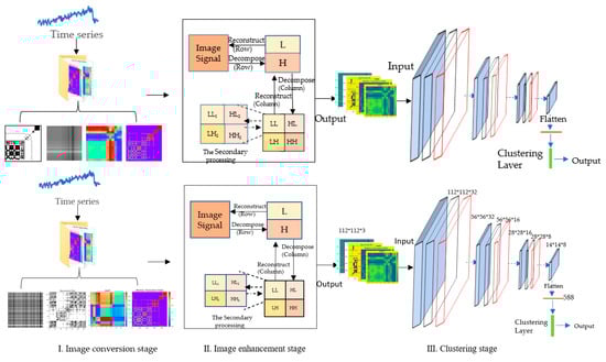 The proposed GW_DC model could convert the original time-series into two-dimensional images and then classify them into some groups. For comparison, time-series were converted into grayscale images, RP images, MTF images, and GADF images. Meanwhile, the deep clustering network was employed for classifying these enhanced two-dimensional images, and the convolution kernel factorization method was introduced into the DC network for reducing the number of parameters and improving the clustering performance. The frame of the proposed GW-DC model, depicted in Figure 1, consisted of three stages: the image conversion stage, image enhancement stage, and image clustering stage.