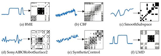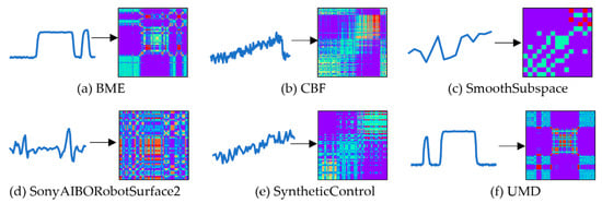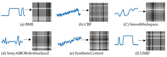 Then the data matrix was transformed into the gray value matrix (GVM), the corresponding gray value was obtained by using the maximum and minimum normalization method [28]. Six time-series datasets from the UCR website were applied to verify the performance of the model and visual display. The samples of four time-series datasets were converted into gray images. The visualization effect is shown in Figure 2.