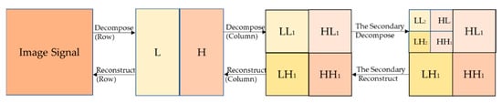 The two-dimensional image signals were filtered in horizontal and vertical directions for realizing the two-dimensional wavelet multi-resolution decomposition. First, the signals of the images were decomposed according to the line for obtaining the low-frequency component and high-frequency component in the horizontal direction. Then, the columns of the transformed data were decomposed to obtain the low-frequency components ) and high-frequency components in four directions. The reconstructed images could be obtained by inverse discrete wavelet transform in the opposite direction. The aforementioned process of image decomposition and reconstruction is described in Figure 6.