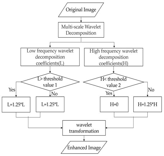 The subband was an approximate representation obtained using a low-pass wavelet filter. The subband was obtained using a low-pass wavelet filter and a high-pass wavelet filter, which showed the singularity of the image in the horizontal direction. The subband was obtained using the aforementioned two filters and represented the singular characteristics of the image in the vertical direction. The subband, obtained using a high-pass wavelet filter, indicated the diagonal edge characteristics of the images. Different measures were taken for the low-frequency and high-frequency components to improve the contrast of the images and strengthen the texture details in the images. If the low-frequency coefficient was greater than 250, it was multiplied by 0.75. If the high-frequency coefficient was less than 150, it was multiplied by 1.25. The aforementioned process is depicted in Figure 7.