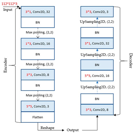 The improved autoencoder consisted of an encoder and a decoder. The encoder stored the parameters of the learned feature representation, and the decoder was employed to reconstruct the data. The encoder was composed of 10 layers, and the number of its channels was 3, 32, 32, 32, 16, 16, 16, 8, 8, and 8, respectively. The small 3 ∗ 1 receptive field was set in the first convolution layer, followed by the second convolution layer with a 1 ∗ 3 effective receptive field. Then, the convolution kernels of 3 ∗ 3 and 5 ∗ 5 were subsequently added to obtain comprehensive distinctive features. The first three convolution layers were followed by batch normalization (BN) and max pooling. The flattening operation for learned feature representation was performed at the end of the encoder. The decoder consisted of 10 layers, and the number of its channels was 3, 8, 8, 8, 16, 16, 16, 32, 32, and 32, respectively. The decoder network contained four convolution layers with weight, as shown in Figure 8. The first three convolution layers of the decoder were followed by BN and upsampling operation. Relu non-linearity was applied to every convolution layer. Then, the numerical probability of the predicted output was mapped to [0, 1]. The process of the DC is depicted in Figure 9.