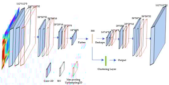 In this stage, an unsupervised deep clustering network DC was designed and applied. The target of the DC network was to define a parametric nonlinear mapping from the data space to the low-dimensional feature space, and complete clustering in the low-dimensional space. Following the idea of the DEC model and the inception network, a deep clustering network DC was designed. The DC included an improved autoencoder for feature learning and a clustering layer for clustering.
