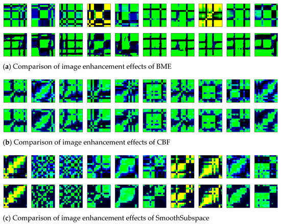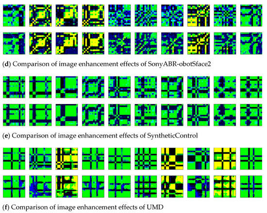 The time-series of six datasets were transformed into two-dimensional images by the GADF, and the obtained images were denoised and enhanced by the wavelet transform method. To visualize the effect of image enhancement, the original two-dimensional images (shown in Line 1) and the enhanced images (shown in Line 2) of six datasets were displayed, as shown in Figure 10a–f.