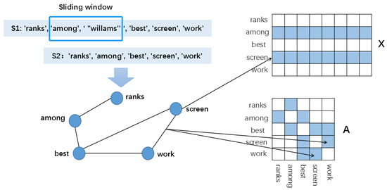 We constructed individual graphs for each document in the short text corpus. We represented words as nodes and the co-occurrence relationship between words as edges, denoted as , where is the set of nodes and is the set of edges. First, we preprocessed the text, including cleaning and tokenizing [28], to obtain the word sequence . Second, we removed the stop words, including the stop words of NLTK (http://www.nltk.org/) (accessed on 30 November 2021) and the words with word frequencies less than 5 in the corpus, to obtain the word sequence . Third, a fixed-size sliding window (length = 4 at default) was used to generate edges according to word co-occurrence on word sequences . If the word in the sliding window does not appear in the sequence, then delete the node and corresponding edge in the graph. Finally, the embedding of nodes in each document graph were initialized with word embedding, denoted as , where is the embedding dimension. An example of constructing a document graph is shown in Figure 2.