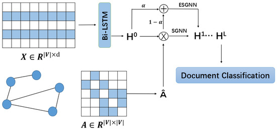 Recently, it has been found that by decoupling the GCN’s feature transformation and propagation and removing the nonlinearities between GCN layers, the improved GCN is more efficient than the traditional GCN in many tasks [46,47]. Inspired by the above research, we propose SGNN and ESGNN models for short text classification. The model architecture is shown in Figure 3. Since Bi-LSTM can capture bidirectional semantic dependencies, it can well model the sequential information of documents. Therefore, for each document in the short text corpus, Bi-LSTM is used to extract the contextual information between words, learn the unique word representations of each document, and then update the feature matrix of the document graph. Then, we use the simplified GCN to aggregate the features of neighboring nodes on average and update the word node representation. The formulas of the SGNN model are as follows: