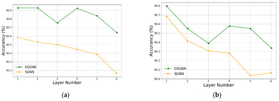 (a) Test accuracy by different SGNN and ESGNN layers for MR; (b) test accuracy by different SGNN and ESGNN layers for Searchsnippets.
