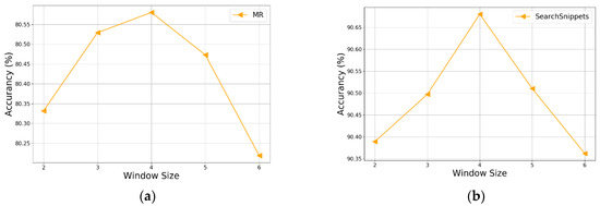 Figure 5 shows the effect of different window sizes on the performance of the SGNN model in MR and Searchsnippets. The generalization ability of the model increases with increasing window size, and each word node has more neighbors, which increases the scope of feature exchange to learn the representation of word nodes more accurately. For both datasets, the model obtains the best results when the window size is equal to 4. However, when the window size is larger than 4, the performance of different datasets shows a different downward trend. This may be because large window sizes may not introduce very close edges for word nodes, resulting in excessive feature exchange.
