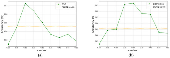 Test accuracy by different values of α for SGNN. (a) Test accuracy for R52; (b) test accuracy for Biomedical.