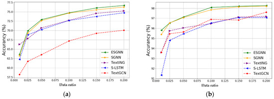 GCNs can perform well with a low label rate during training [45]; therefore, to test the robustness of the model for semi-supervised tasks [59], we use different proportions of training datasets to test graph-based models. For MR and SMS, we reduce the training data to 1%, 2.5%, 5%, 10%, 15% and 20%, respectively. Figure 7 shows the test results of ESGNN, SGNN, TextING, S-LSTM, and TextGCN. We note that with the increase in training data, our ESGNN and SGNN models perform better than TextING, S-LSTM, and TextGCN in most cases. The extraction of sequential features also helps to generate a more accurate representation for the word nodes of the test set, which do not appear in the training set, and gives our model stronger feature extraction and text representation abilities in limited training labeled documents.